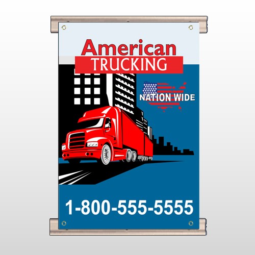 This design has blue and gray background with an animated image of a moving red truck against a black silhouette city creating the idea of movement. The text is white and red with areas for your editable information such as your company name, logo and phone number.