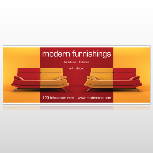This design has a yellow and red background with a couch upholstered with the opposite to its background color. The text is white and black with areas for editable information such as the company name, products, address, and web address.