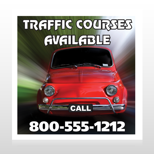 This design has a white background with an interesting multicolor zoom effect which leads the eye to the center to a red car as if telling the consumer this car is on the fast track of life. The text is white with a black stroke with the business name and phone number.