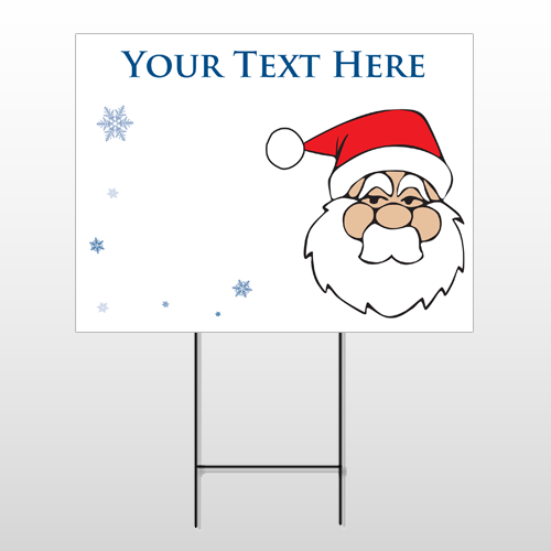 This design has a white background with blue snowflakes. There is a Santa Claus head to the right of the design. The text is blue and says "Your Text Here".