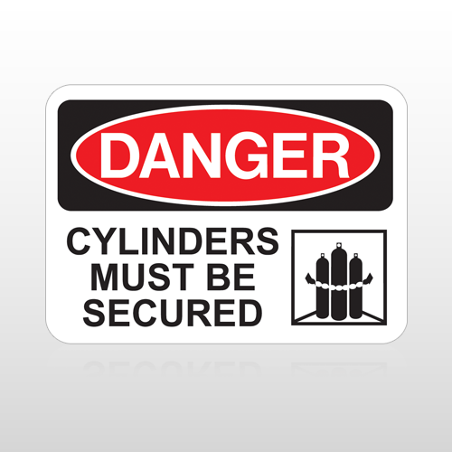 This design is of a safety sign in the danger category. The design display a black background with a red circle in the center with the word Danger in the center. The text is black and states cylinders must be secured and has an image of 3 cyliners being secured by a chain.