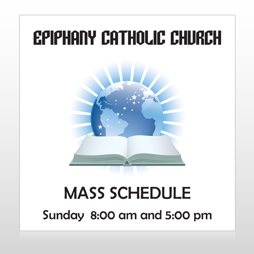 This design has a white background with an image of a glowing blue world with a book open in front of it along with stars flowing like a sash around the world giving the idea that with that book you can see and learn about the world. The text is black with the name of your church and scheduled times.