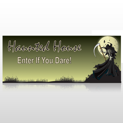 This design has a black and yellow glow to the background, with a reaper and a full moon with bats flying in the background. The text is cream and black and says "Haunted House Enter If You Dare!"