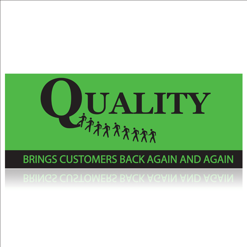 This design has a green and black background. The text is black and says "Quality brings customers back again and again"