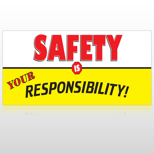 This design has a white upper background with a yellow lower background. There is a black line that divides the two colors. The upper text is red and says "Safety". It has a stop sign with the text "Is" in the middle. The lower text is red and black and says "your responsibility!"