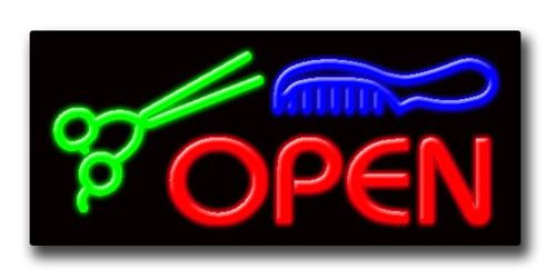 This is a Red Neon "OPEN w/Scissors & Comb" Sign. Neon Signs are one of the best and brightest forms of advertising, and last for many years when cared for properly.