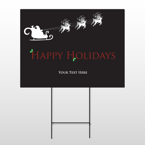 This design has a black background with Santa and his reindeer in white. The text is red and white and says "Happy Holidays Your Text Here".