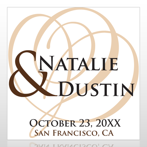This design has a white background with tan scrolls on it. The text is black and brown and has room for your first names in large font. It also has an area for your date and place.