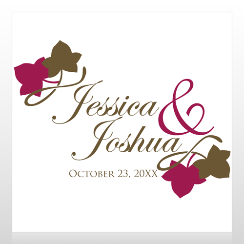 This design has a white background with pink and brown leaves. The text is brown and says "Jessica & Joshua" "October 23, 20XX"