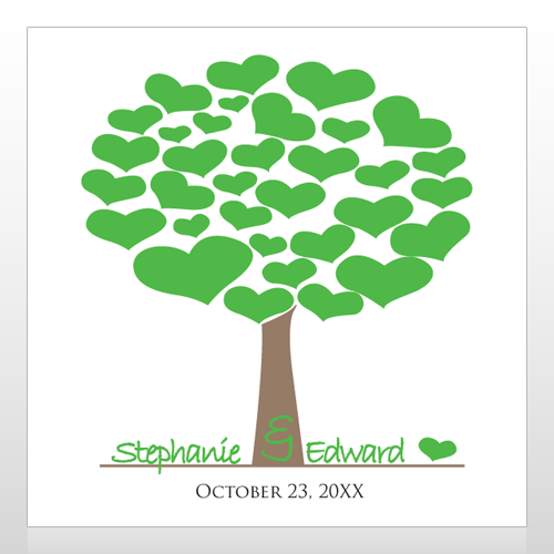 This design has a white background with a green and brown tree full of hearts. The text is green and brown and says "Stephanie & Edward" "October 23, 20XX"
