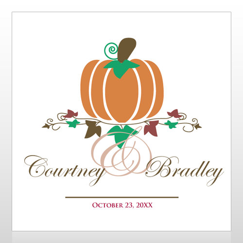 This design has a white background with a pumpkin on it. The text is brown and tan and says "Courtney & Bradley" "October 23, 20XX"
