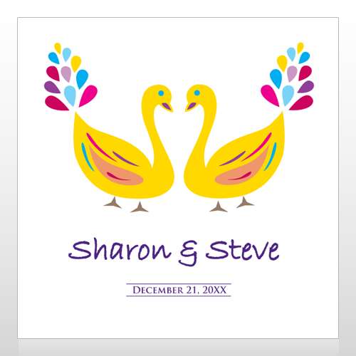 This design has a white background with two yellow ducks with colorful tails. The text is purple and says "Sharon & Steve" "December21, 20XX"