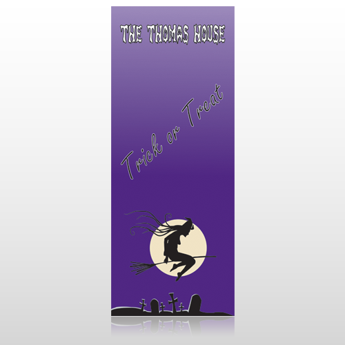 This design has purple background with a witch flying over a graveyard, with a full moon rising in the sky. The text is white and black and says "The Thomas House, Trick or Treat"